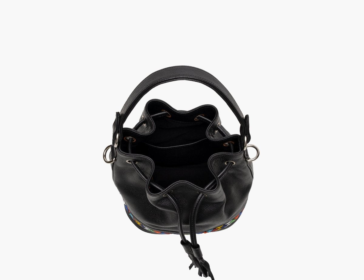 Wipe gently with a soft dry cloth. Avoid contact with moisture on beaded sections. Condition leather occasionally using neutral balm to preserve texture and suppleness.