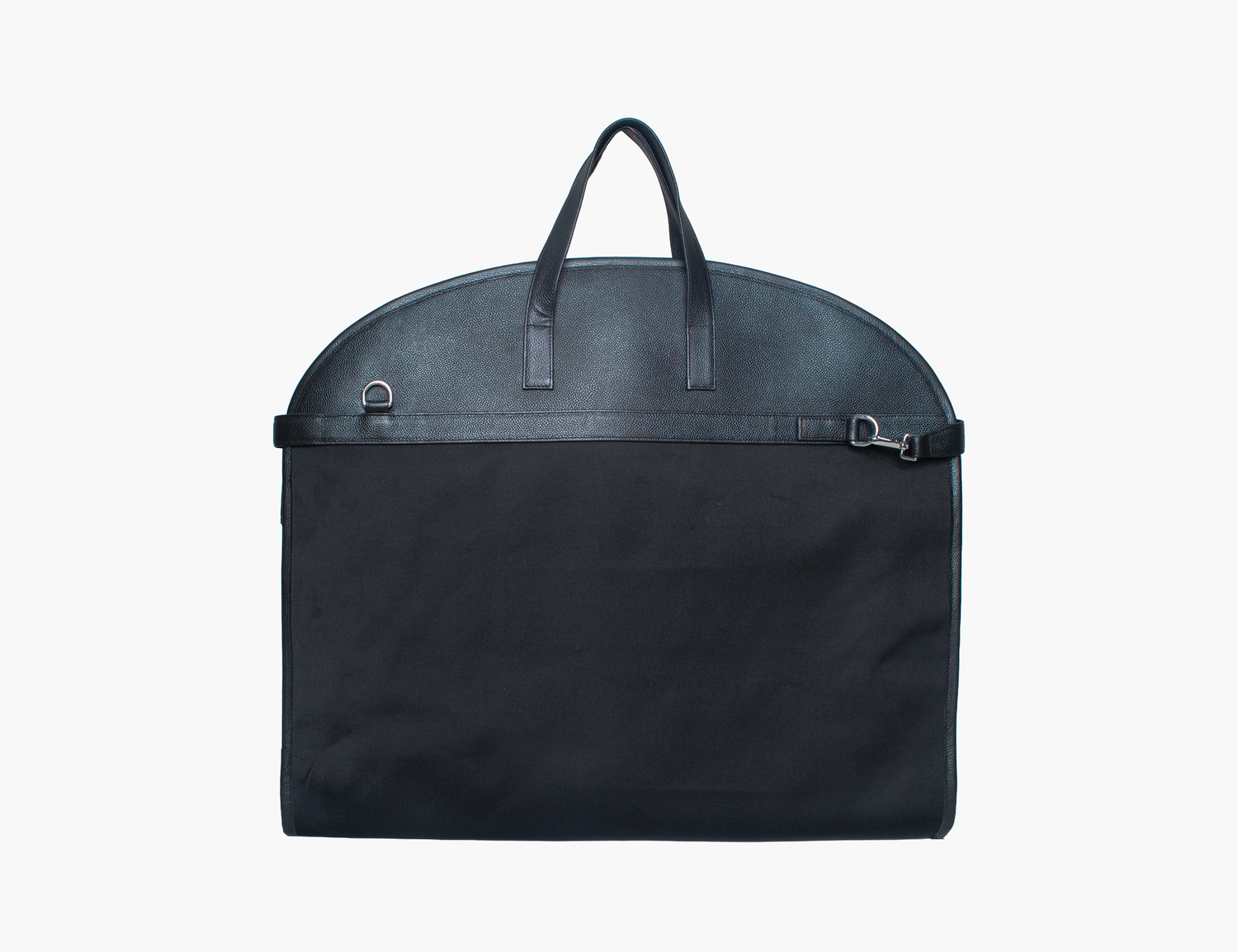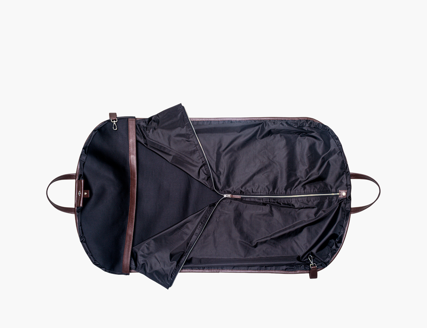 Crafted from premium full-grain Kenyan leather and durable cotton canvas, its minimalist structure prevents hard creasing while maintaining a lean, elegant profile. The bifold design opens fully for easy packing, revealing a smooth fabric interior with a central zip compartment to keep suits, dresses, or jackets neatly in place.