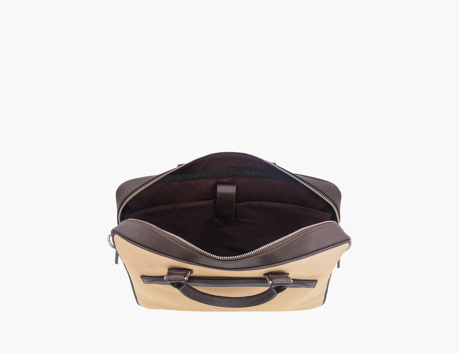 Crafted for sophistication and everyday function, the Adelphi Laptop Bag canvas combines sleek design with durable craftsmanship. Made from premium pebbled leather trim and light duty canvas, it offers a structured silhouette that keeps its form while accommodating your daily essentials. A spacious interior with a padded laptop sleeve and organised compartments ensures effortless practicality for work or travel.