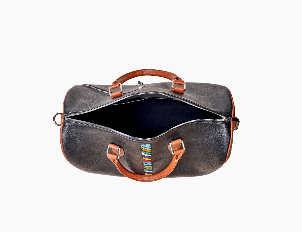 Designed for the discerning traveler, this beaded gym bag seamlessly blends function and artistry. Handcrafted in full-grain pebbled leather with contrast oil pull-up leather trims, it features a striking Maasai-inspired beaded stripe that celebrates refined heritage and craftsmanship. The spacious silhouette and structured form make it ideal for the gym, travel, or stylish weekend escapes.