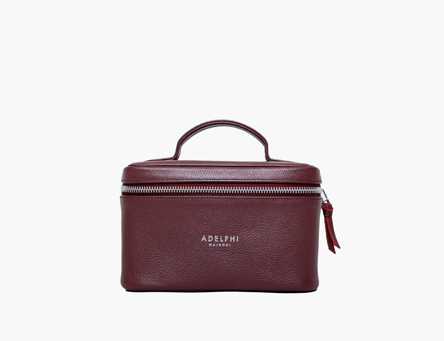 Crafted in rich pebbled leather, this elegant wash bag combines timeless style with everyday function. The structured silhouette opens fully to reveal a rain coat interior with organized compartments for skincare and travel essentials. Finished with polished silver hardware and the signature Adelphi Nairobi embossing — a refined companion for home or away.
